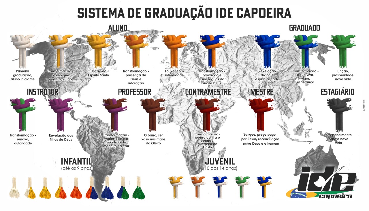 Desenvolvemos o Sistema, baseados nas seguintes cores: Partindo da corda crua (sem cor), para amarela, laranja, azul, verde, roxa, marrom e vermelha. Nas transições de um estágio de desenvolvimento para outro, utilizamos combinações de cores. Para professores e capoeiristas mais graduados que queiram incorporar o escopo da Escola, usamos a corda cinza.